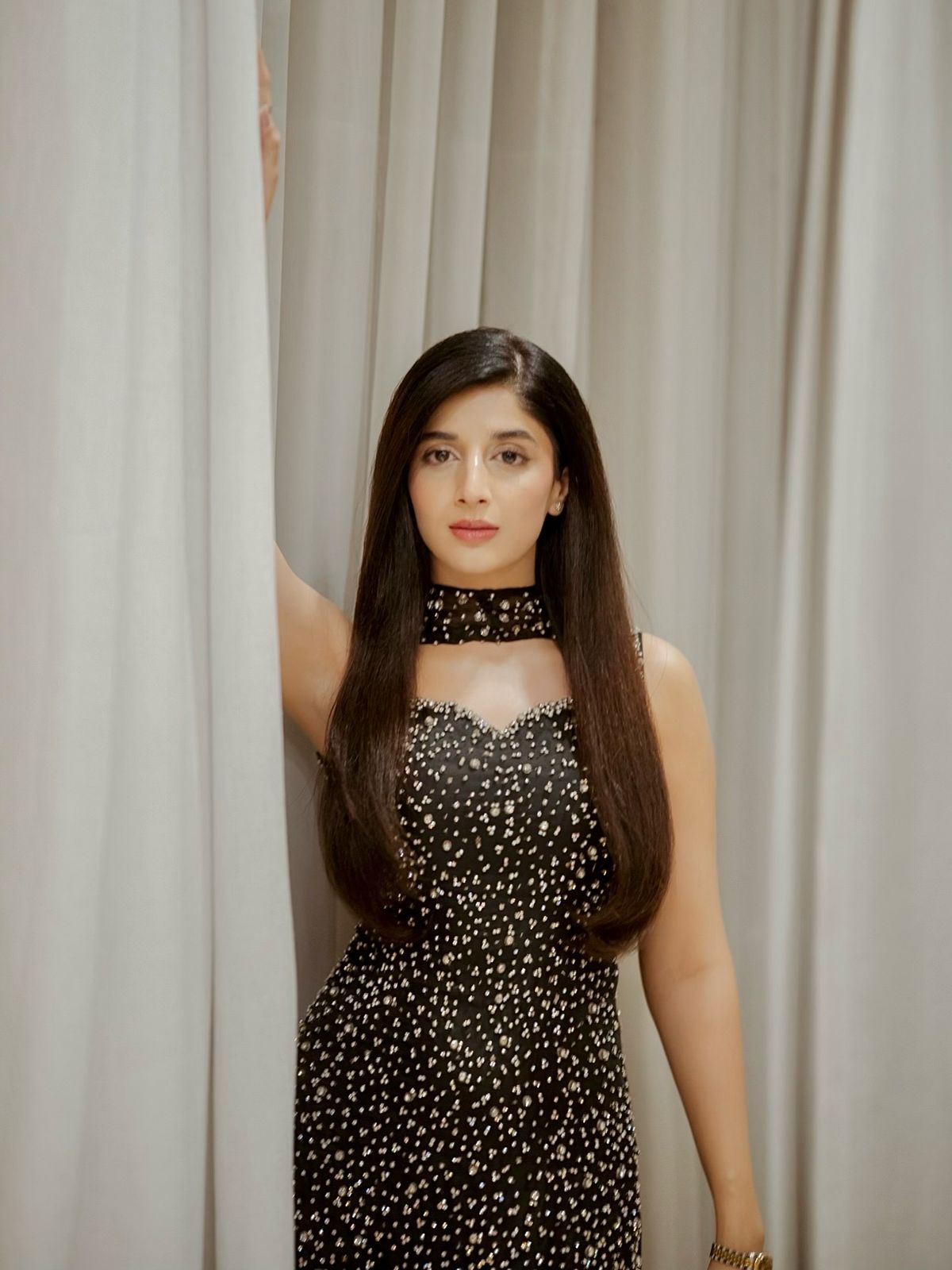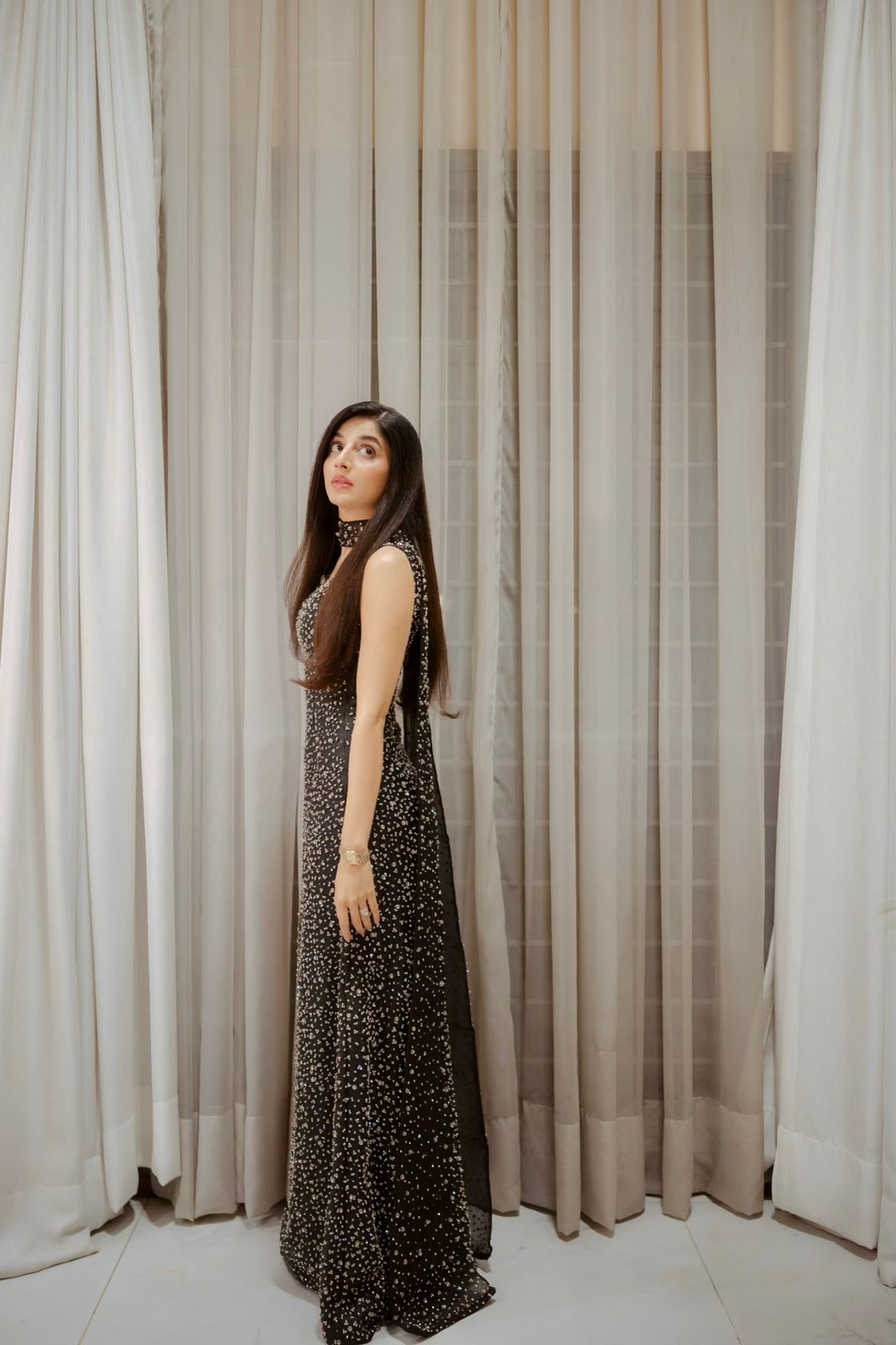 Handcrafted from pure silk organza, the gown is embroidered over 312 hours by master Kaarigars, who meticulously scatter glass stones and beads across the full length of the piece. An elegant sweetheart neckline frames the face with poise, while the elongated cut allows the sheer outer layer to move independently of the body, lending the dress its sense of fluid grace. The inner lining in silk charmeuse ensures an indulgent, weightless feel against the skin.