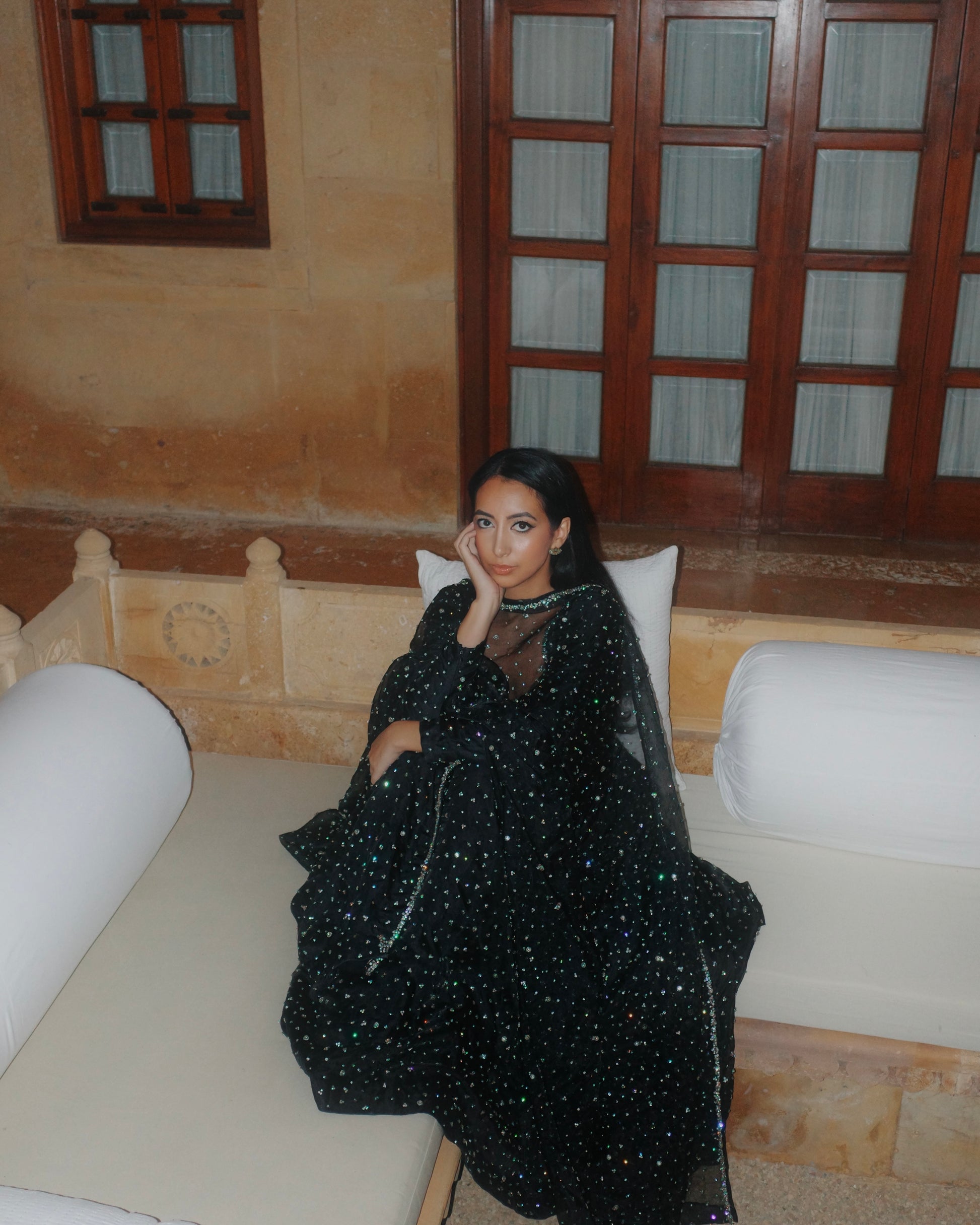 Beneath the peshwas, a black lehnga adds graceful weight and structure, offering fluidity with every step. The accompanying dupatta—also crafted in pure silk organza—is edged with fine embroidery and lightly scattered with matching glass beadwork, casting a soft glimmer that veils the silhouette in understated opulence.