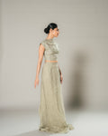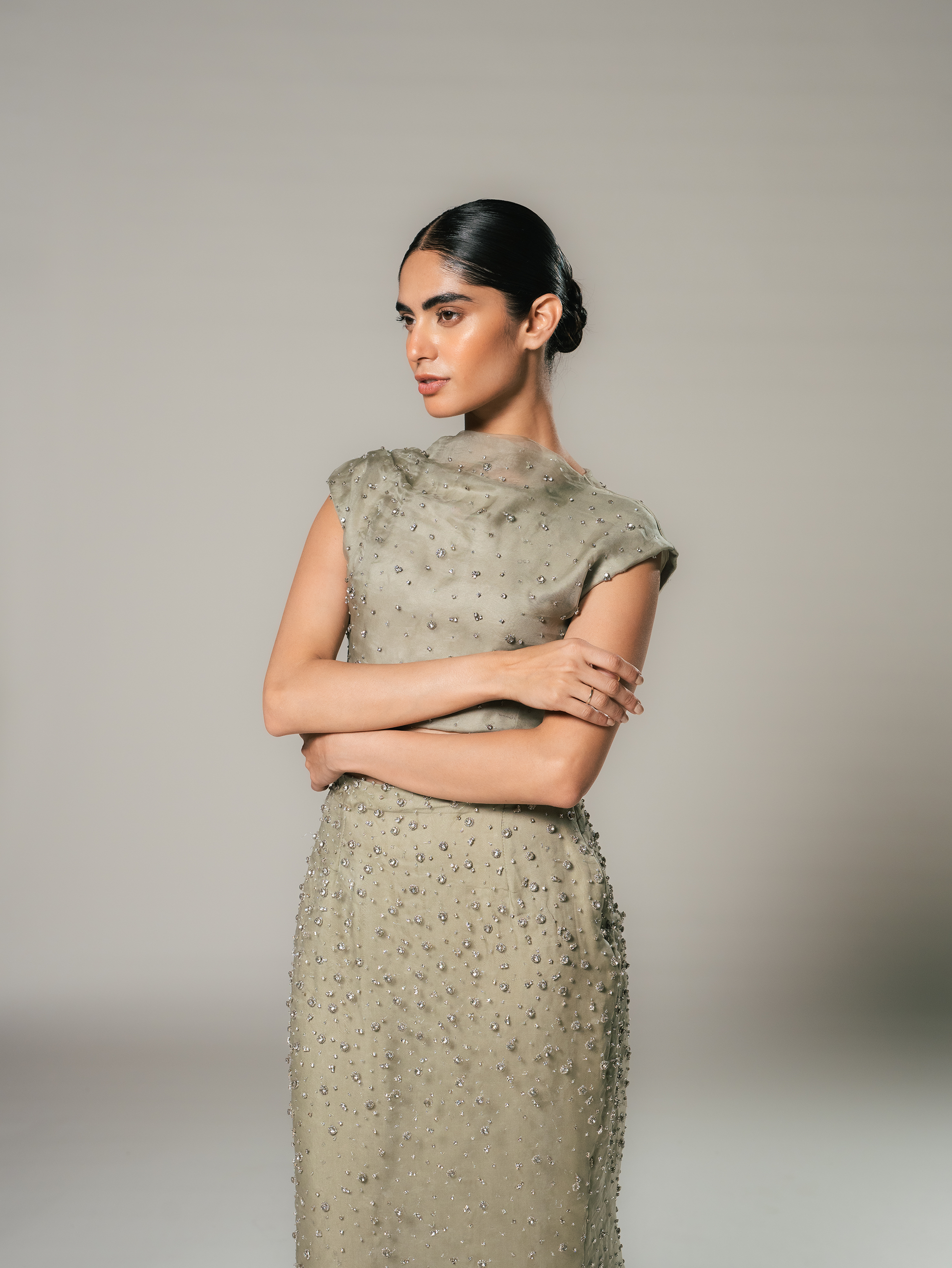Immerse yourself in understated elegance with The Amara Set, a masterful creation in refined sage green. This gown features a sophisticated high-neck design, complemented by subtle folds of double-organza artfully gathered at the shoulders. Such delicate details imbue the piece with a versatility that effortlessly transitions from formal soirées to intimate gatherings. The sage green hue, both serene and timeless, provides the perfect canvas for the intricate craftsmanship that sets this dress apart.