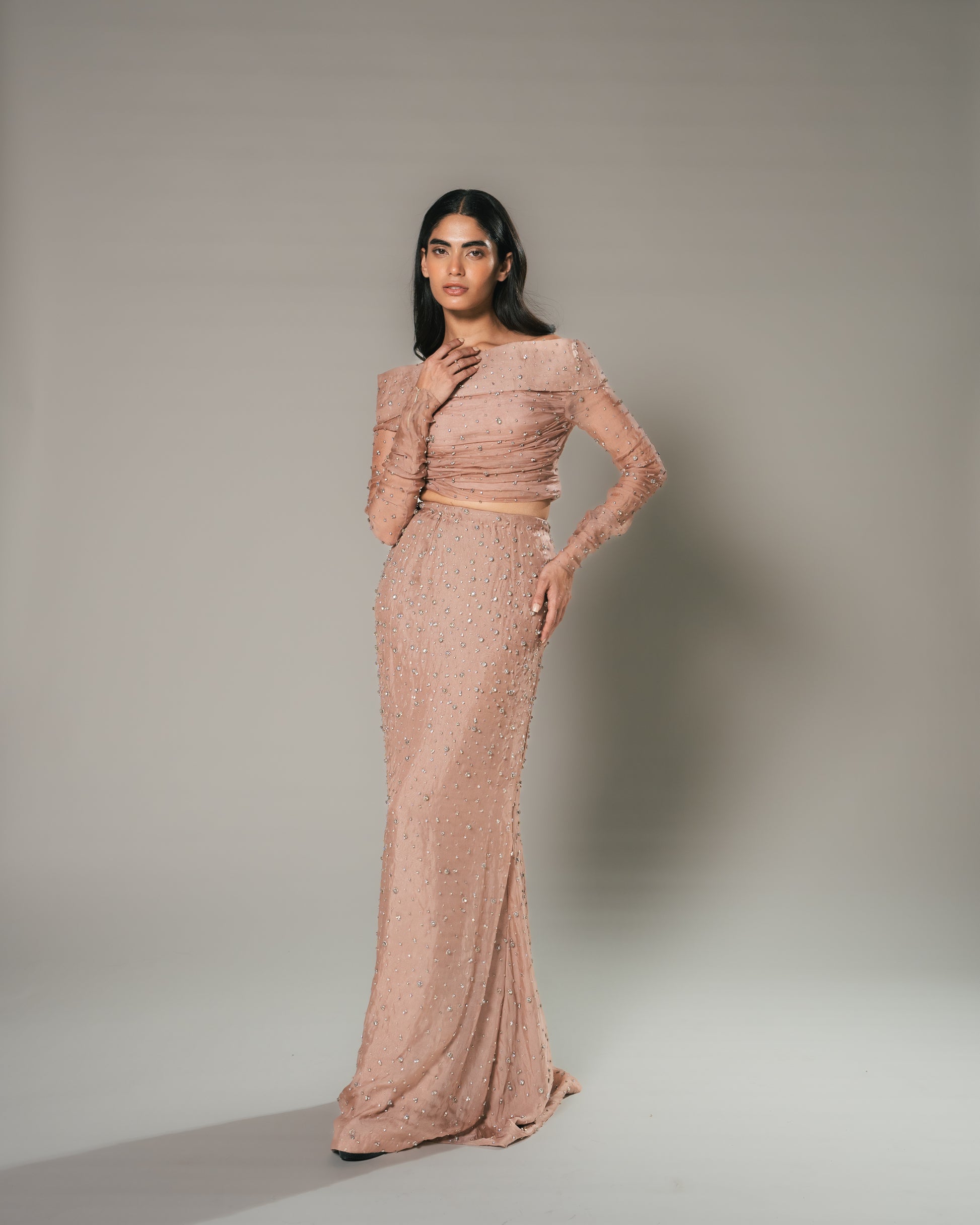 Each stone and glass bead is meticulously hand-embroidered by skilled Kaarigars over the course of 96 hours, ensuring an immaculate finish. The beads are artfully scattered across the choli top and gently cascading into the lehnga, adding a subtle sparkle that enhances the dress’s overall luminosity.