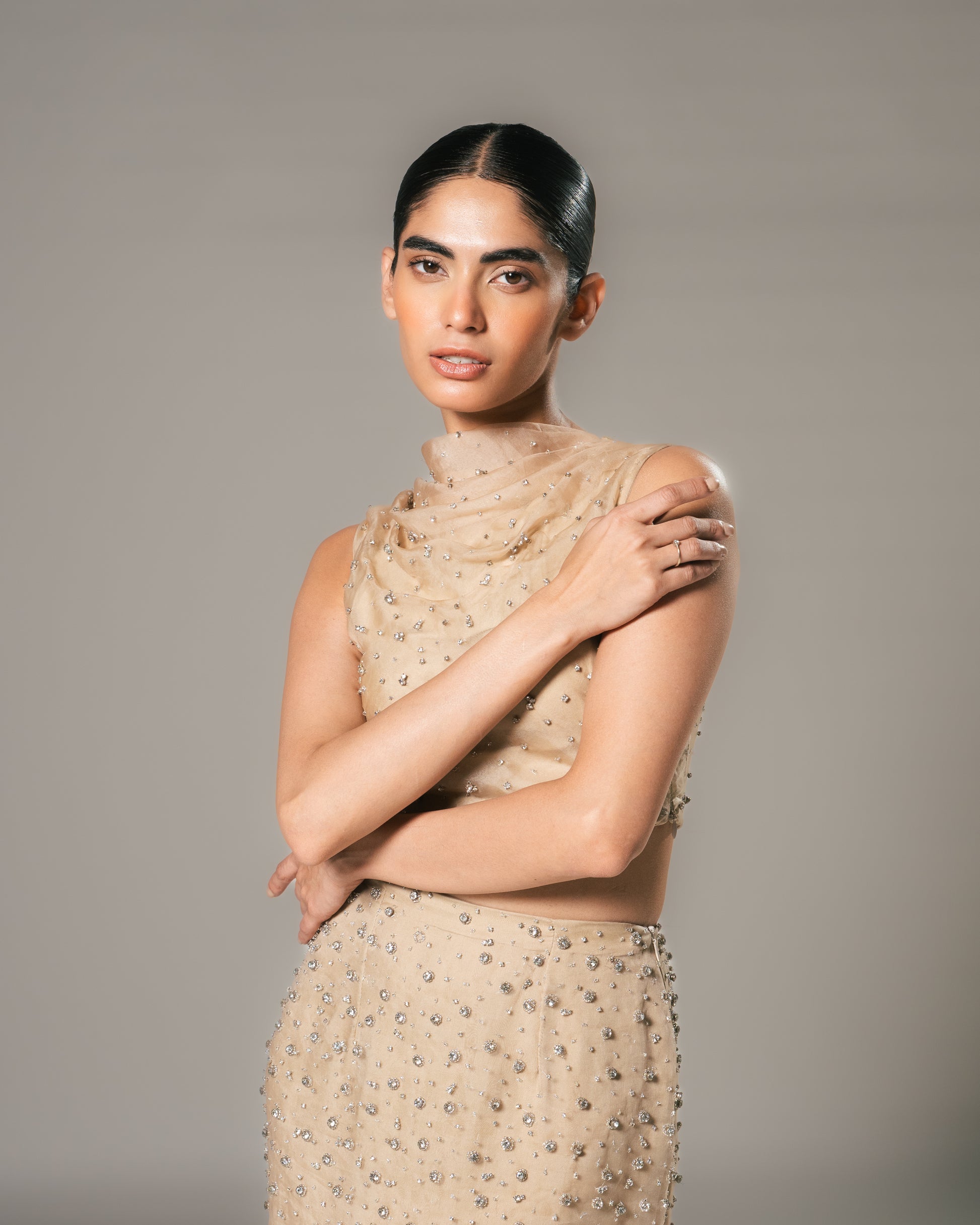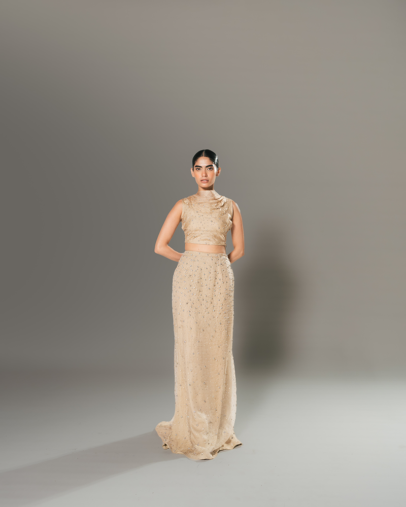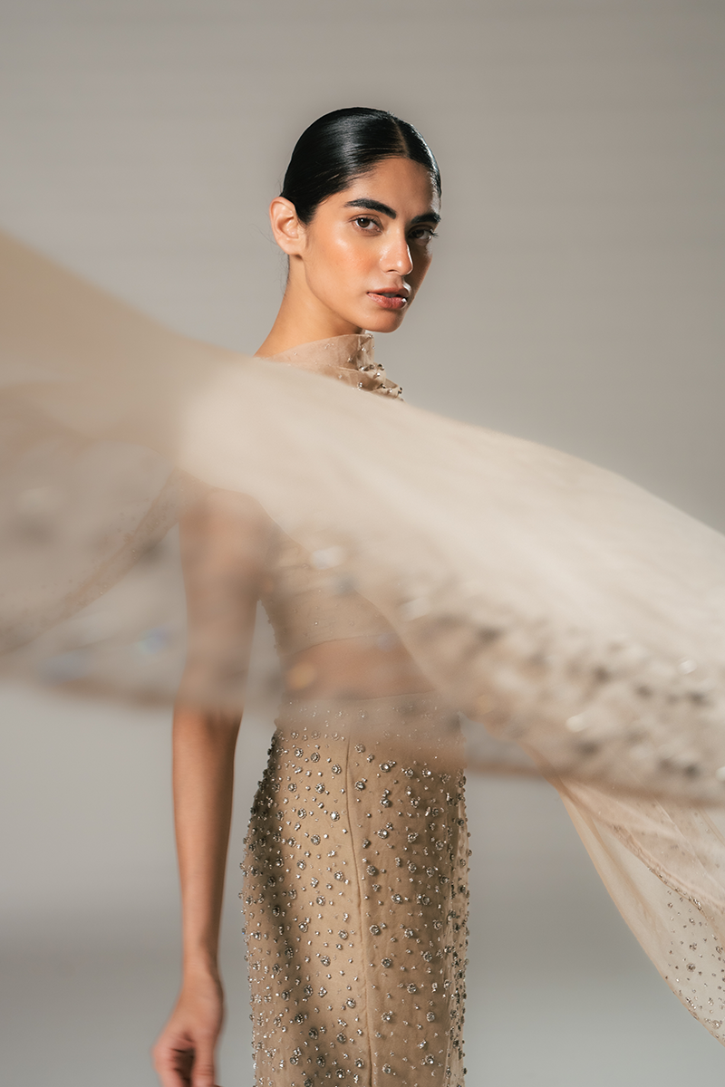Every Hannan Gown is adorned with exquisite hand-embroidery, a testament to the artistry of skilled Kaarigars who invest 96 hours in meticulously placing each stone and glass bead. These embellishments are hook-needled into the pure silk organza, imparting a subtle weight that enhances the gown’s graceful fall and fluidity.