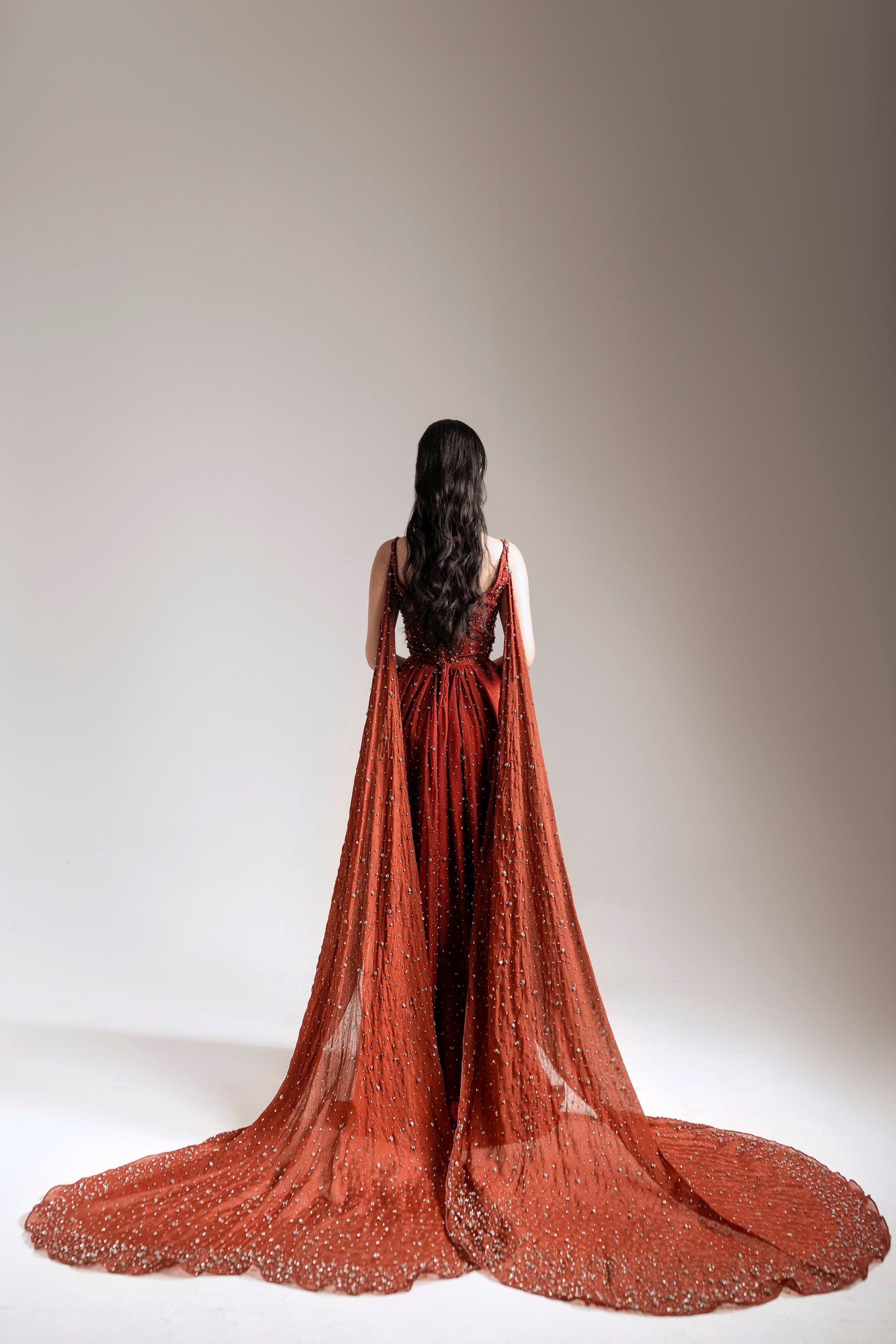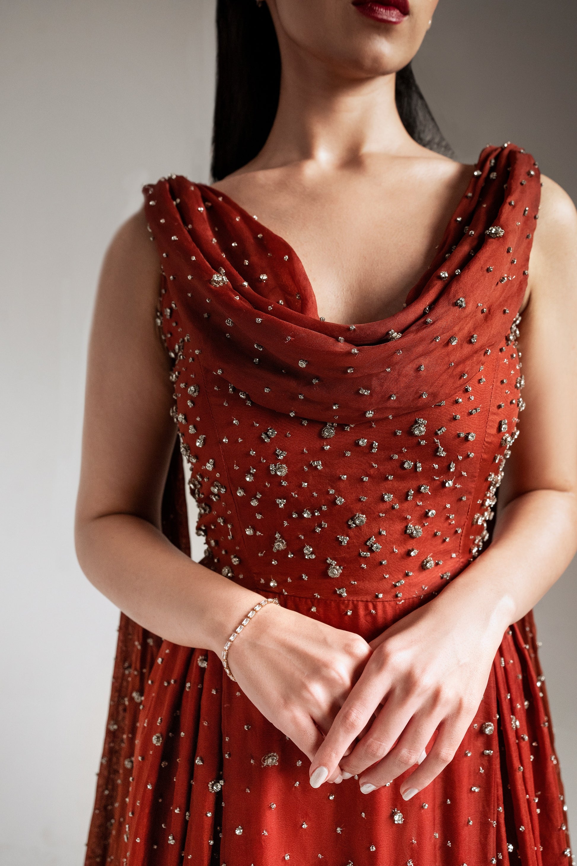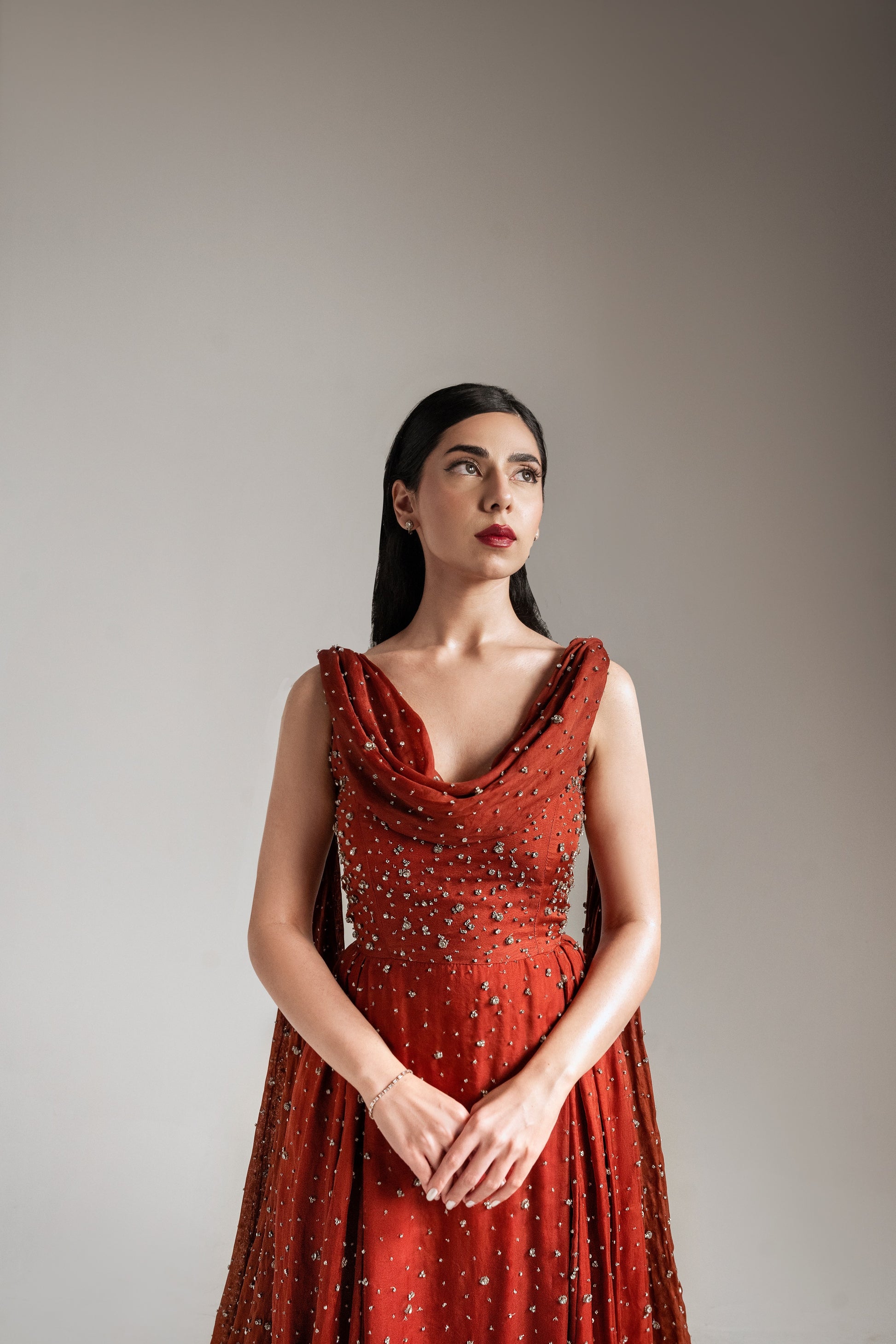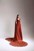 Immerse yourself in the allure of The Inayah Set in Rust Red—a masterfully draped silhouette that channels timeless South Asian grandeur through a contemporary lens. Crafted in pure silk organza, this gown is designed to command attention with its flowing, statuesque form and dramatic floor-length presence that evokes the quiet drama of old-world couture.