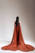 Every Inayah Set is the result of meticulous artistry, requiring 264 hours of dedicated handwork by skilled Kaarigars. The rich rust-red organza is densely embroidered with glass stones and beads, catching the light in subtle, sophisticated flashes. The embroidery is thoughtfully placed across the bodice and cascades seamlessly into the expansive dupatta cape, creating an unbroken visual story of movement and opulence.