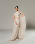 Crafted with meticulous attention to detail, each stone and glass bead is hand-embroidered by skilled Kaarigars over 96 hours, ensuring that every element is flawlessly executed. The glass beads and crystals are hook-needled into pure silk organza, imbuing the translucent fabric with a subtle weight that contributes to its graceful fall and fluid movement.