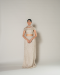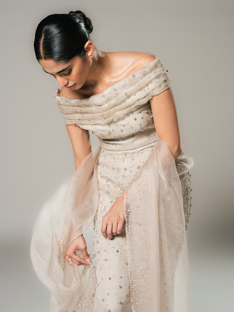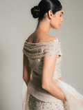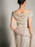 The Nawal Set boasts an exquisitely crafted off-shoulder neckline, adorned with delicate folds of organza and intricately embroidered with stone and glass beading. The shimmering accents play against the collarbone, creating a mesmerizing effect that highlights the dress's exquisite detailing.