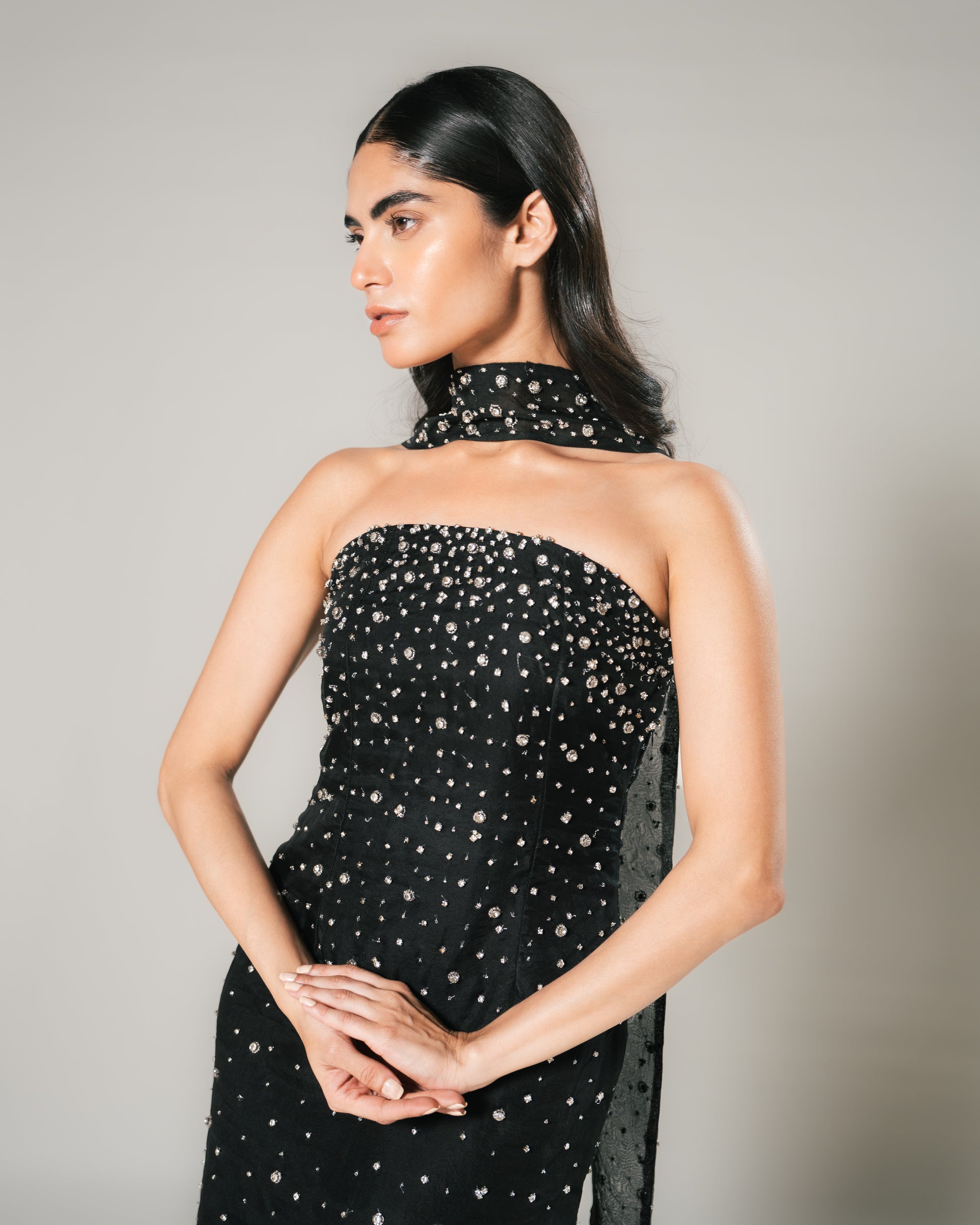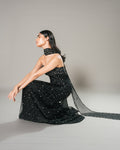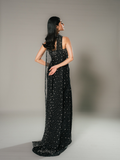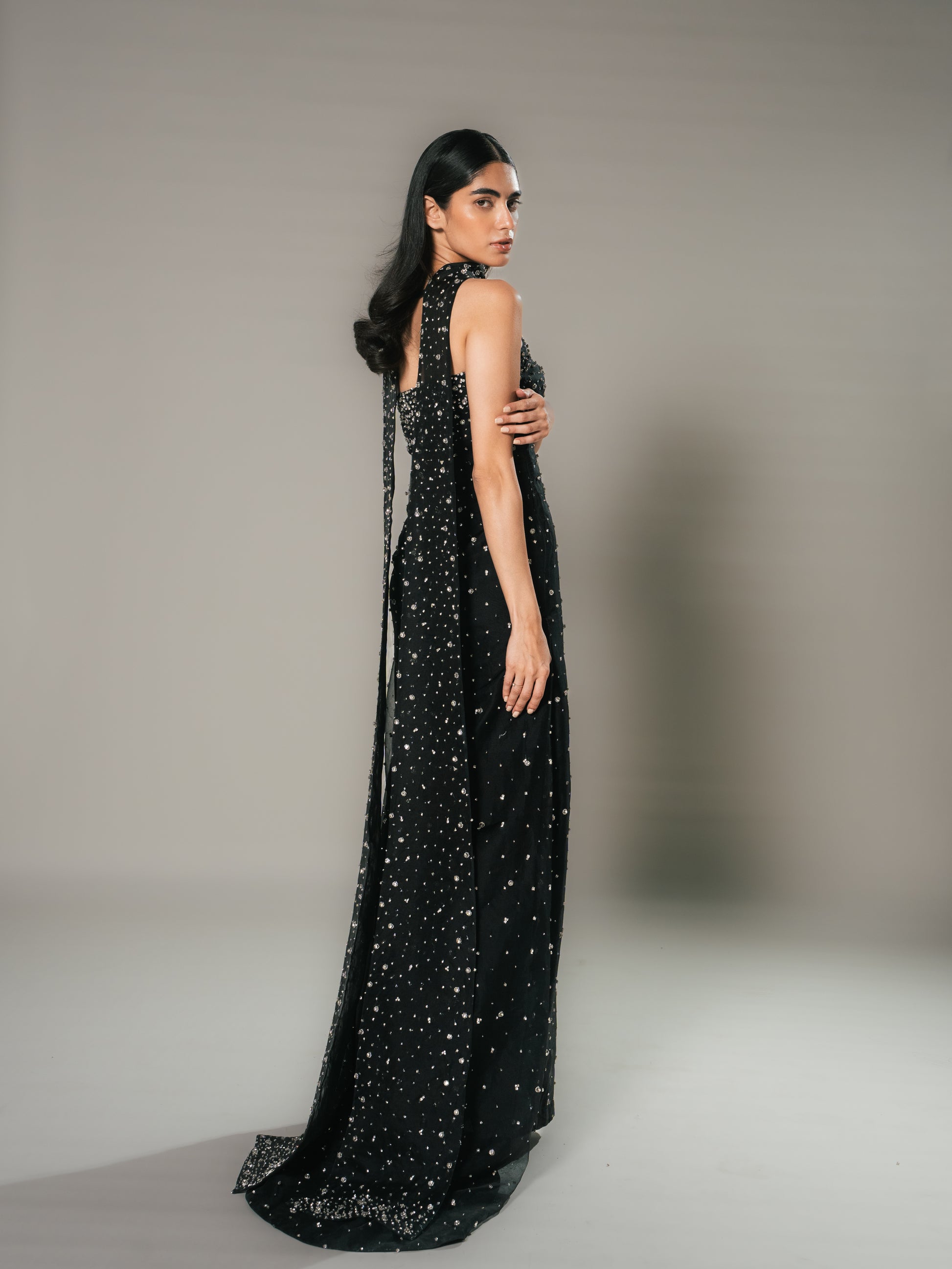 Each Sakina Dress is the result of an extraordinary 96 hours of delicate handwork by master Kaarigars, who carefully embroider each stone and glass bead. This intricate embroidery begins with concentrated artistry at the neckline, gradually cascading down the gown in a mesmerizing pattern that evokes the Rumi poem: “We come spinning out of nothingness, scattering stars like dust.” This poetic imagery is reflected in the scattered brilliance of the embellishments, which subtly capture and refract light, creating an ethereal effect.